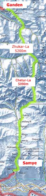 ![]() Our Trek starts about 45 km NE of Lhasa and connects two historical monasteries: Ganden in the north and Samye in the south. The latter is the cradle of Tibetan Buddhism - it was here, where in 755 AD after a two-year scholars’ debate Buddhism was made the state religion of Tibet. Before we reach our destination though we have to cross two side chains of the Himalayas conquering two high passes over 5,000m: Zhukar-La at 5200m and Chetur-La at 5090m. |